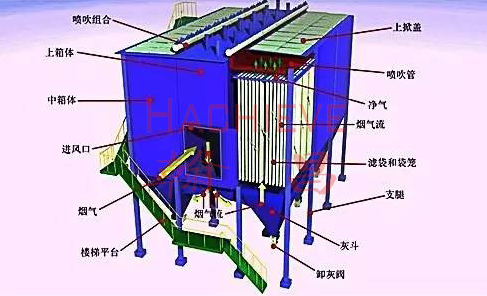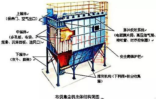 主要由灰斗、过滤室、净气室、支架、提升阀、喷吹清灰装置等部分组成。工作时,含尘气体由风道进入灰斗。大颗粒的粉尘由于重力作用,直接落入灰斗底部,较小的粉尘随气流转折向上进入过滤室,并被阻留在滤袋外表面,净化了的烟气进入袋内,并经滤袋口和净气室进入,比较后通过风机的作用把洁净的空气排放出去。